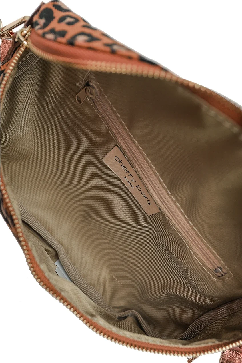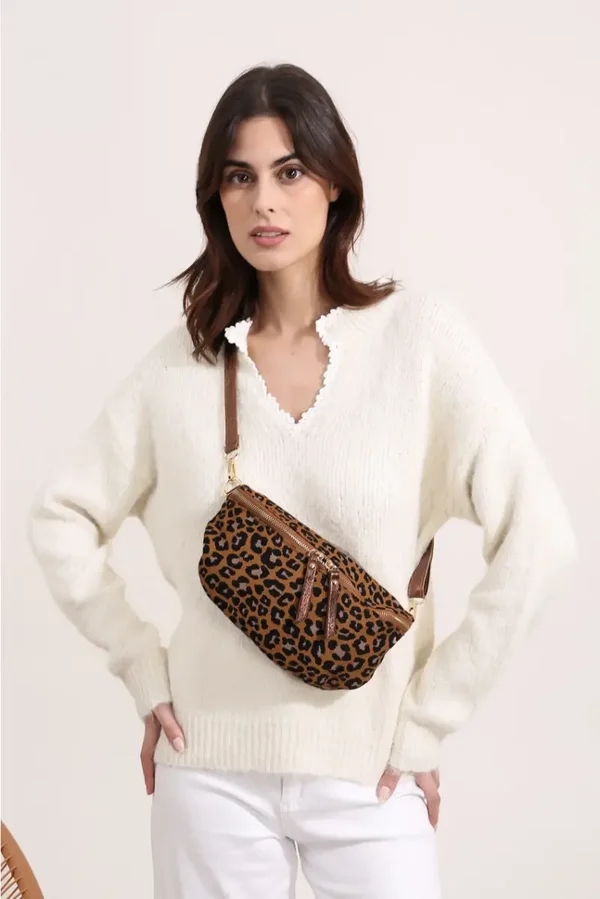 Schöne Gürteltasche aus Stoff mit Leopardenmuster. In der Tasche habt ihr ein weiteres kleines Fach mit Reißverschluss. Die Tasche bekommt ihr mit einem abnehmbaren Schultergurt, so könnt ihr Flexibel die Bänder tauschen. Die Tasche hat eine Größe von 26x15x6cm