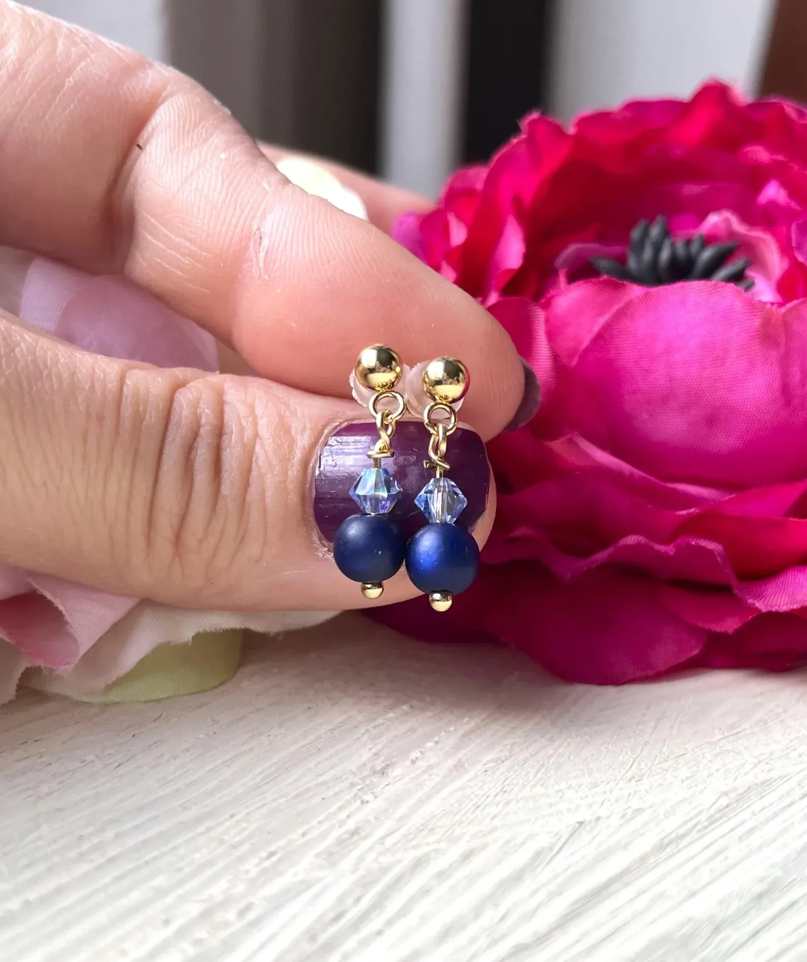 Diese eleganten handgemachten Ohrringe vereinen zeitlose Schönheit mit zartem Glanz. Die Kombination aus dunkelblauen Polarisperlen und hellblauen Kristallen verleiht ihnen eine edle, moderne Note – perfekt für Alltag, Büro oder festliche Anlässe.